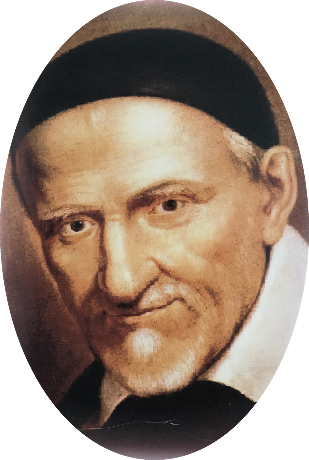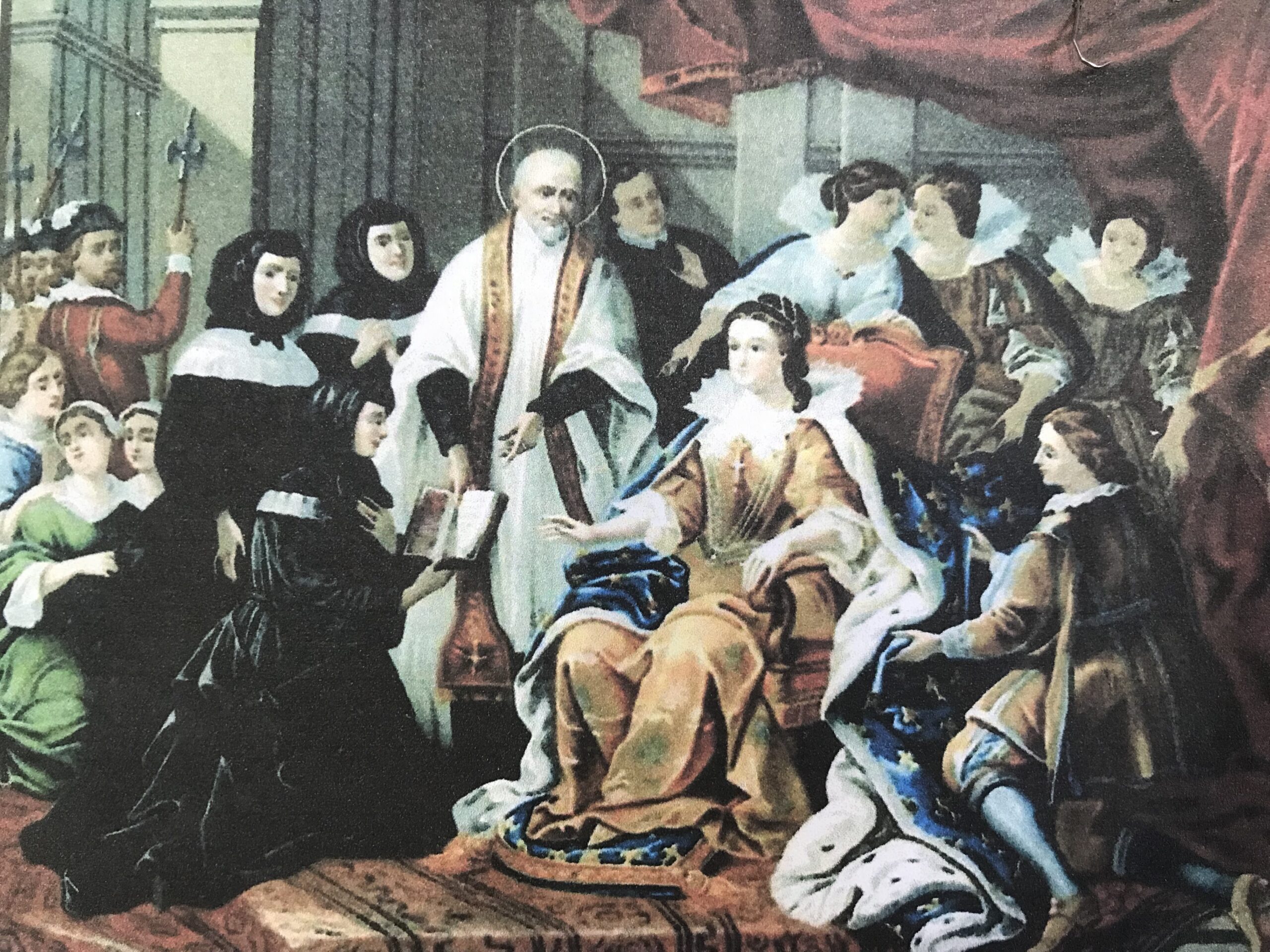 En la foto aparece San Vicente de Paúl y las primeras damas de la caridad en Paris, Francia en 1617